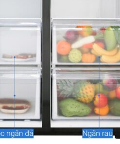 Quan sát ở hình ảnh bên trên ta có thể thấy được tủ lạnh được thiết kế gồm 3 phần chính : phần bên trái là cửa và ngăn làm đá,phần bên phải là cửa và ngăn làm lạnh,bảng điều chỉnh .– Cửa và ngăn làm đá (bên trái) :