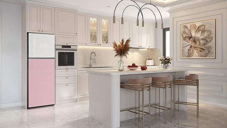 So với các mẫu tủ lạnh ở trên, chiếc tủ lạnh đến từ thương hiệu Samsung này được thiết kế tương đối lạ mắt với hai màu trắng, hồng kết hợp cùng 2 chất liệu cao cấp (Mặt gương/ Mặt gốm) cho bạn tự do lựa chọn theo sở thích và cá tính riêng. Dòng tủ này được đánh giá có tính nghệ thuật cao, đẹp mắt.