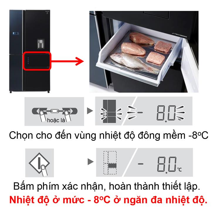 Ngăn điều chỉnh đa nhiệt độ của tủ lạnh Sharp có thể tùy chỉnh nhiệt độ linh hoạt từ -18°C đến 3°C, đáp ứng nhu cầu bảo quản đa dạng các loại thực phẩm khác nhau. Tính năng cấp đông mềm ở ngăn ngày sẽ hoạt động ở -8°C.