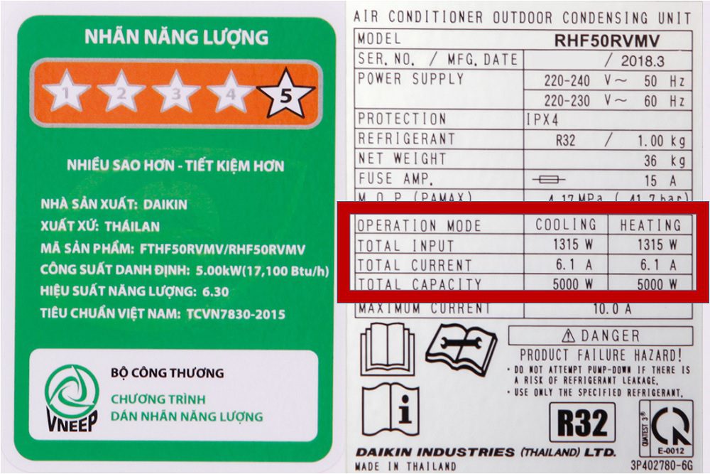 Như vậy với Máy lạnh 2 chiều Daikin FTHF50RVMV ở trên có công suất lạnh là 5000W và công suất tiêu thụ điện là 1315 W = 1,315 kW.