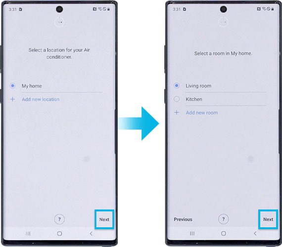 - Chọn vị trí và phòng ưa thích cho máy điều hòa không khí và chạm vào Tiếp theo trên màn hình.