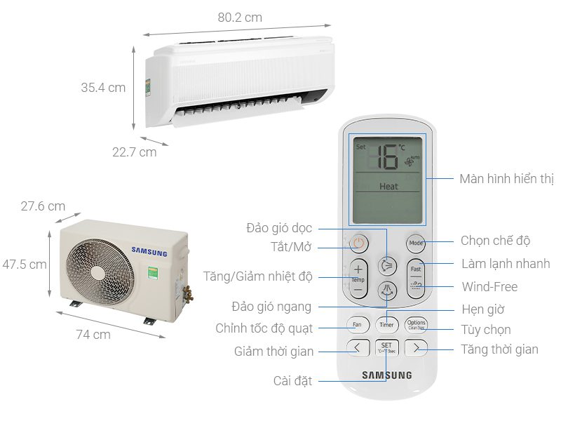 - Kích thước dàn lạnh: Dài 80.2 cm – Cao 35.4 cm – Dày 22.7 cm