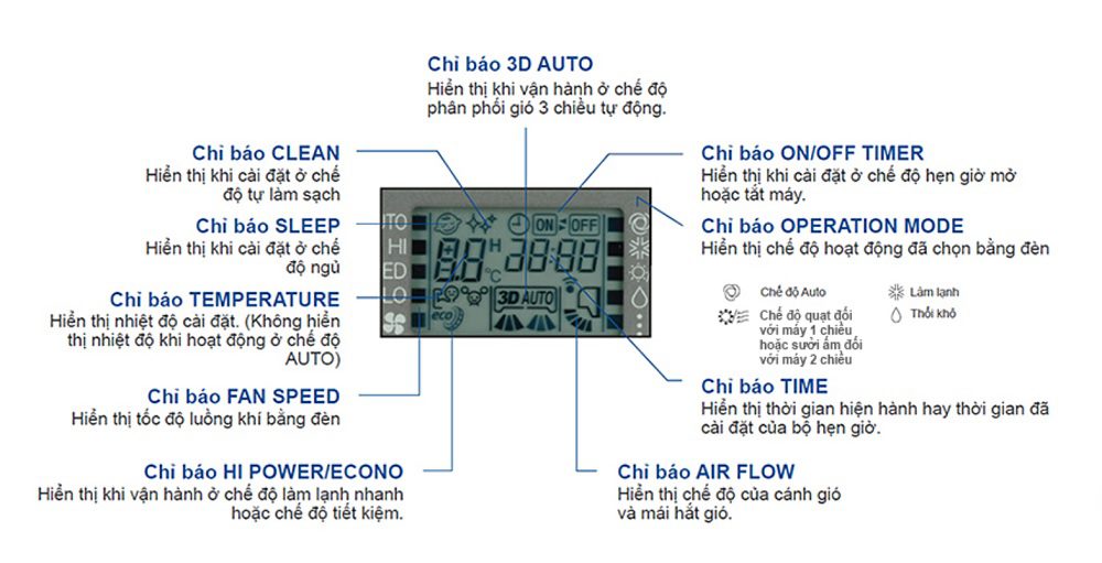 Các chế độ lần lượt sẽ là Tự Động (Auto), Làm Mát (Cool), Làm Khô(Dry), Làm Nóng – Heat ( đối với dòng điều hòa 2 chiều).