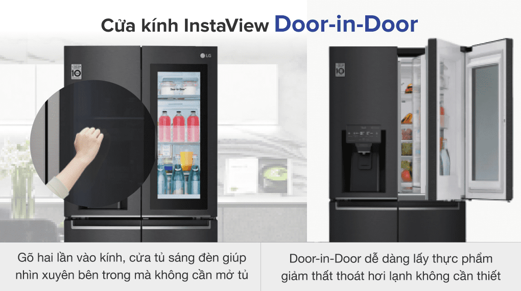 - Kiểu cửa trong cửa là thiết kế độc quyền của hãng LG, trên dòng tủ LG Door in Door với cửa kính trong suốt InstaView được lắp đặt bên trên cửa chính cho phép người dùng quan sát và lấy thực phẩm bên trong tủ mà không cần mở toàn bộ cửa chính. Bên cạnh đó, tủ chỉ cần gõ nhẹ 2 lần vào cửa kính, đèn sẽ được bật sáng và bạn có thể nhìn xuyên thấu, xem thêm 23% những gì bên trong tủ.