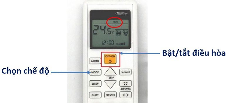 Khi bạn thấy điều hoà Panasonic không mát chỉ có gió thì hãy chỉnh lại chế độ làm lạnh bằng cách nhấn vào nút MODE trên remote điều hòa. Khi màn hình điều khiển hiển thị chữ Cool hoặc hình bông tuyết là được